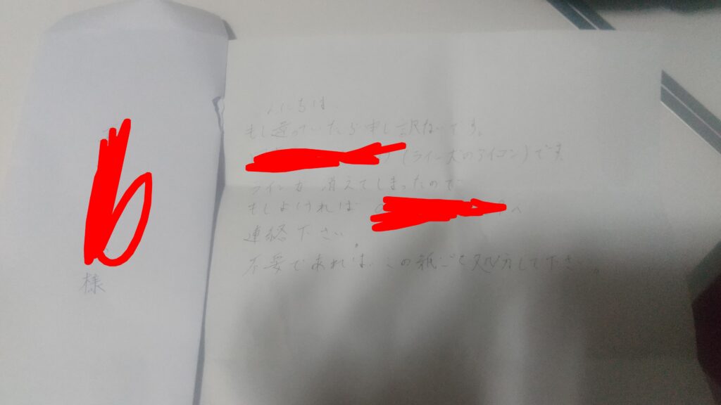 何とか私と連絡が取れないものかと思い、さっきこの付近を回っていたら私の車を見つけたので(ポストに家族3人の名前が書いてあるから、私の家だと確信したと思われる。LINEは本名で登録してるし、私の名前は知ってるはずだから)、ポストに手紙を入れたとのこと。